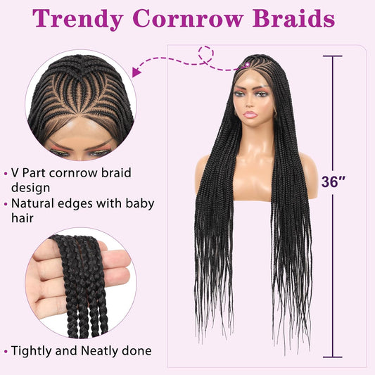 13X8 Inch HD Lace Front Cornrow Braided Wigs for Women Box Braided Wigs with Baby Hair Middle Part Premium Synthetic Lace Front Long Black Box Braid Wig 36 Inch